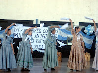 Las alumnas del Taller de Aerobic pertenecientes a 6º año EGB, junto a las profesoras Ana Andrada y Adriana Bustamante, homenajearon a nuestra enseña patria con un “tangofusión “ unión de tango con música electrónica ,y al compás de La Cumparsita y con un vestuario tanguero emocionaron al público utilizando nada menos que un paracaídas con los colores de nuestra Bandera.